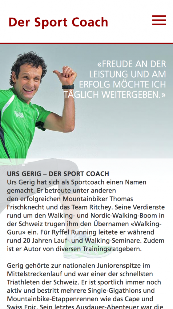 ← ↑ → Arbeiten | Newsletter Internetpräsenz für Urs Gerig «Der Sport Coach» Kunde Der Sport Coach Leistungen Design & Entwicklung Eigenschaften OnePage, Content-Management-System & Responsive Design sportcoach.ch ← ↑ →